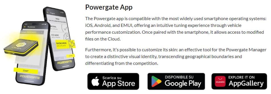 The Powergate app is compatible with the most widely used smartphone operating systems: iOS, Android, and EMUI, offering an intuitive tuning experience through vehicle performance customization. Once paired with the smartphone, it allows access to modified files on the Cloud.